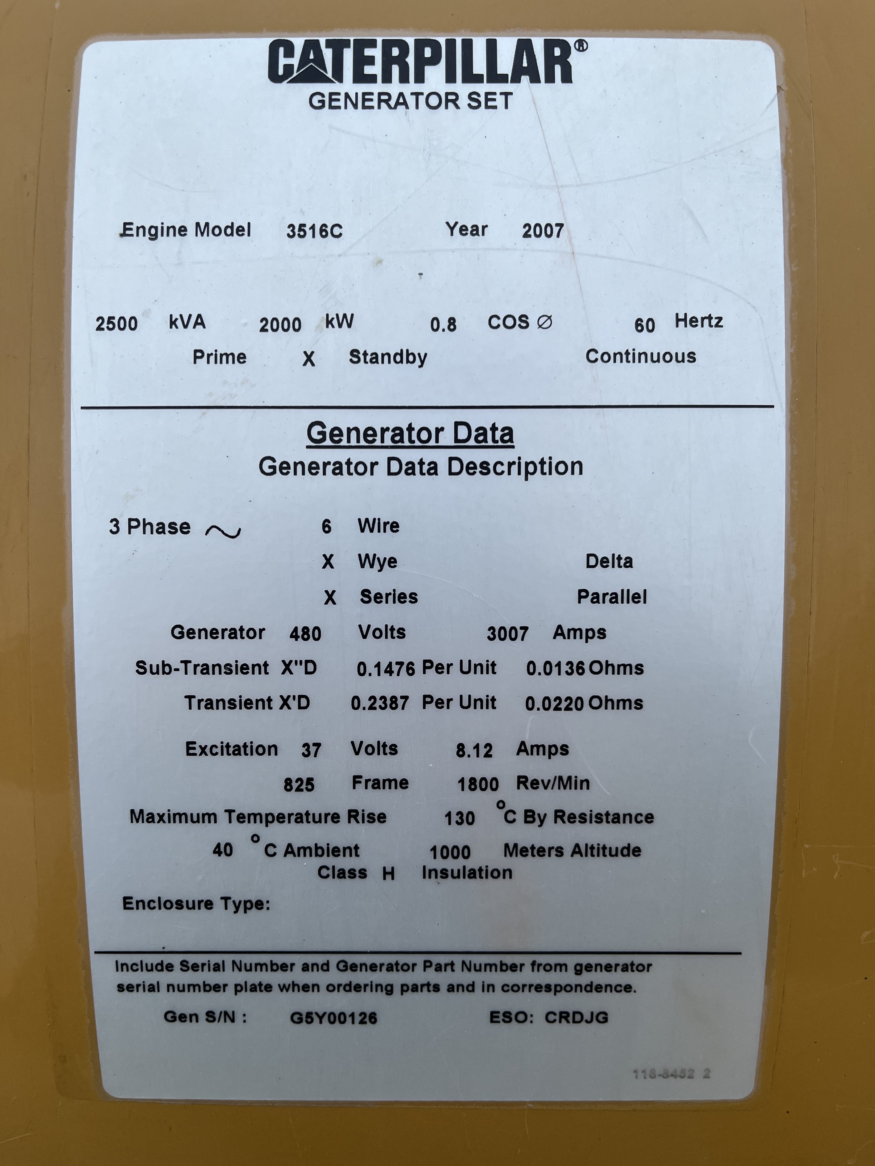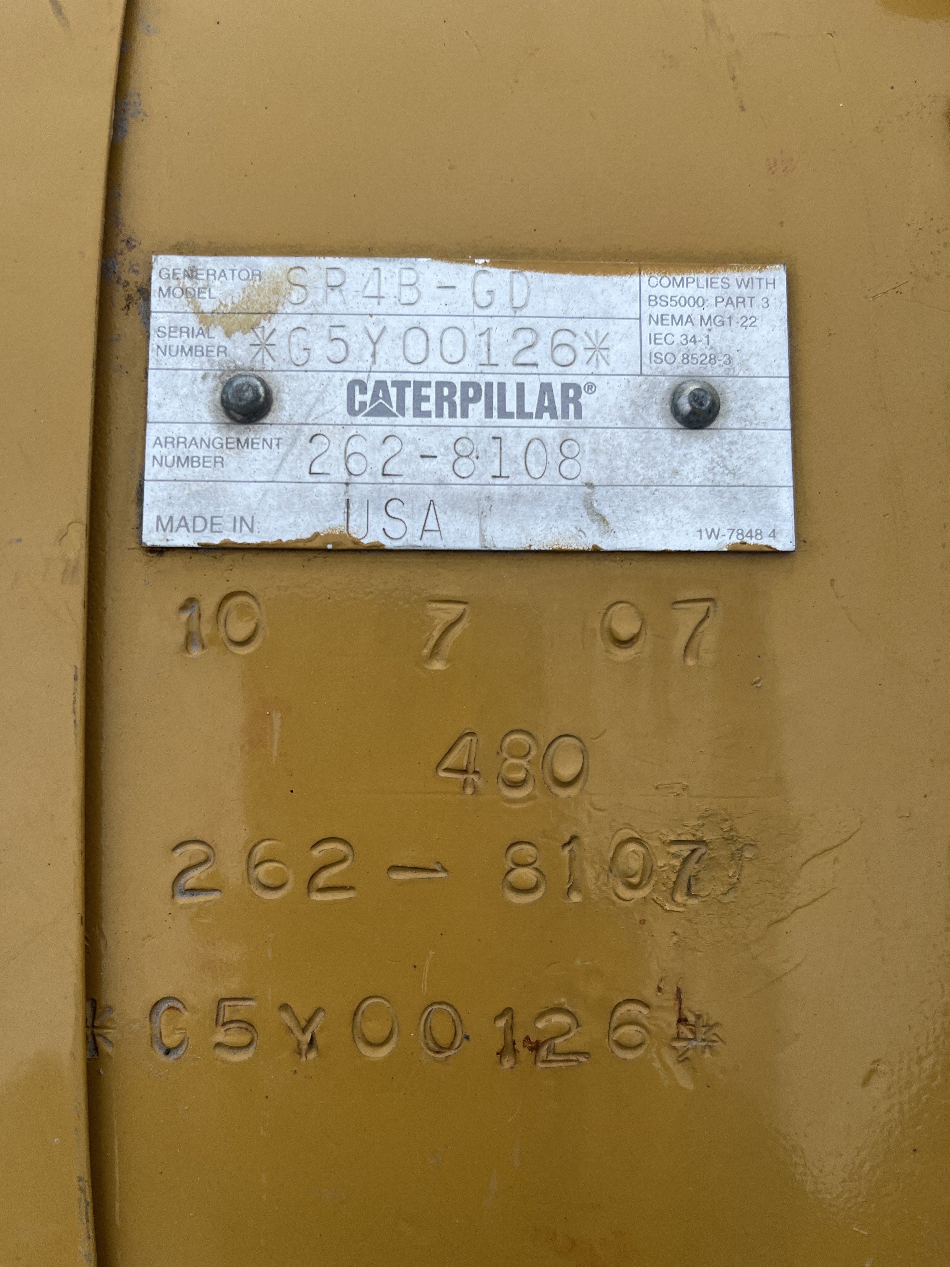 - DESCRIPTION: 2007 Caterpillar SR4-GD Generator End Serial# G5Y00126, Arrangement# 262-8108, 2000kW Standby/1825kW Prime, 480V (6-wire), 60Hz, 0.8pf, 1800RPM, 825 frame, 21 flywheel, single-bearing, 00 housing, 0.667 pitch, PMG, 1,833 Original hrs., Good Running Condition, Standby Take-off. Generator-End Only, No Engine, Recently Removed from a 3516C. DIMENSIONS: L – 108” W – 84” H – 72” Weight: 4,000 lbs.