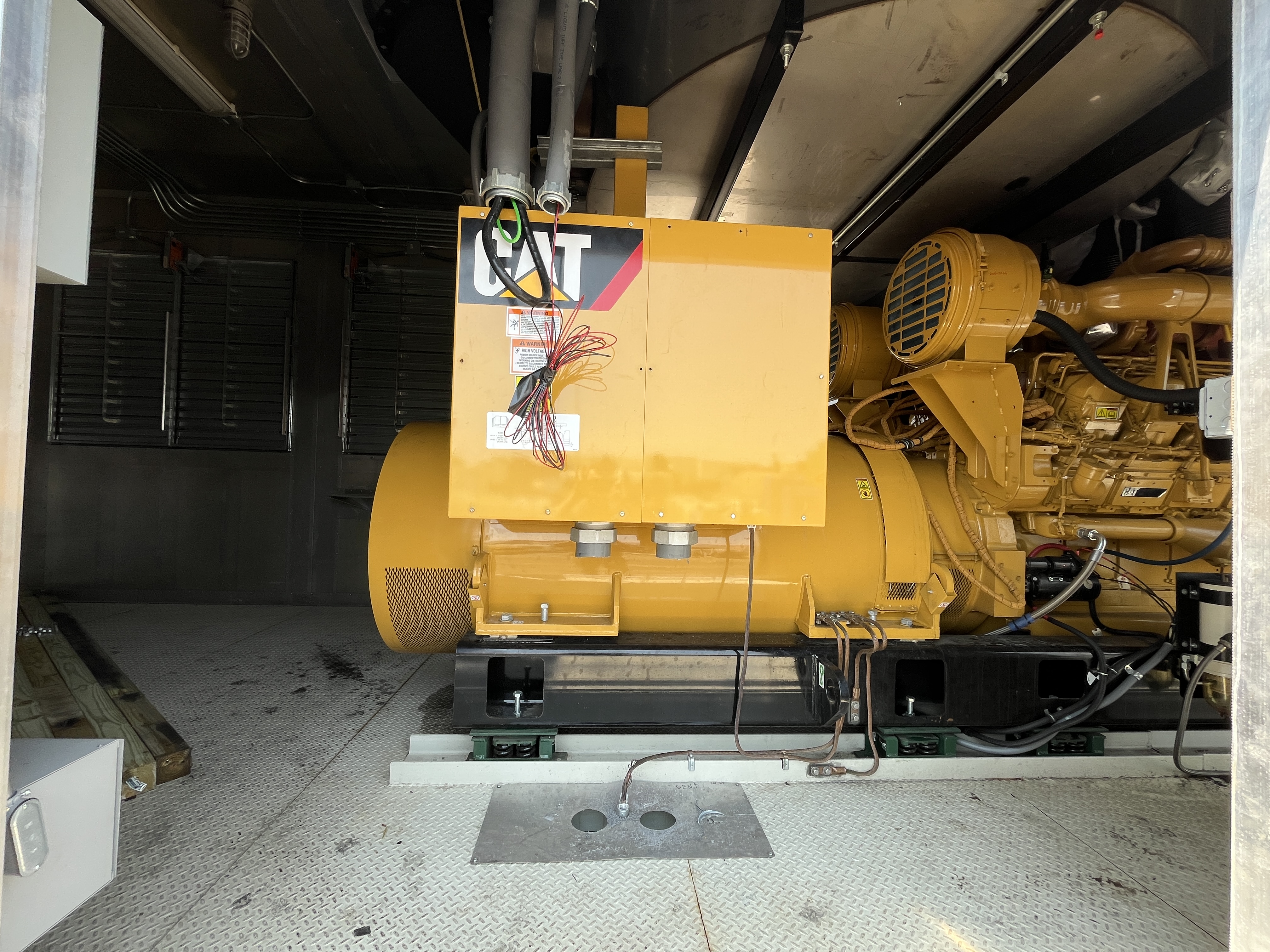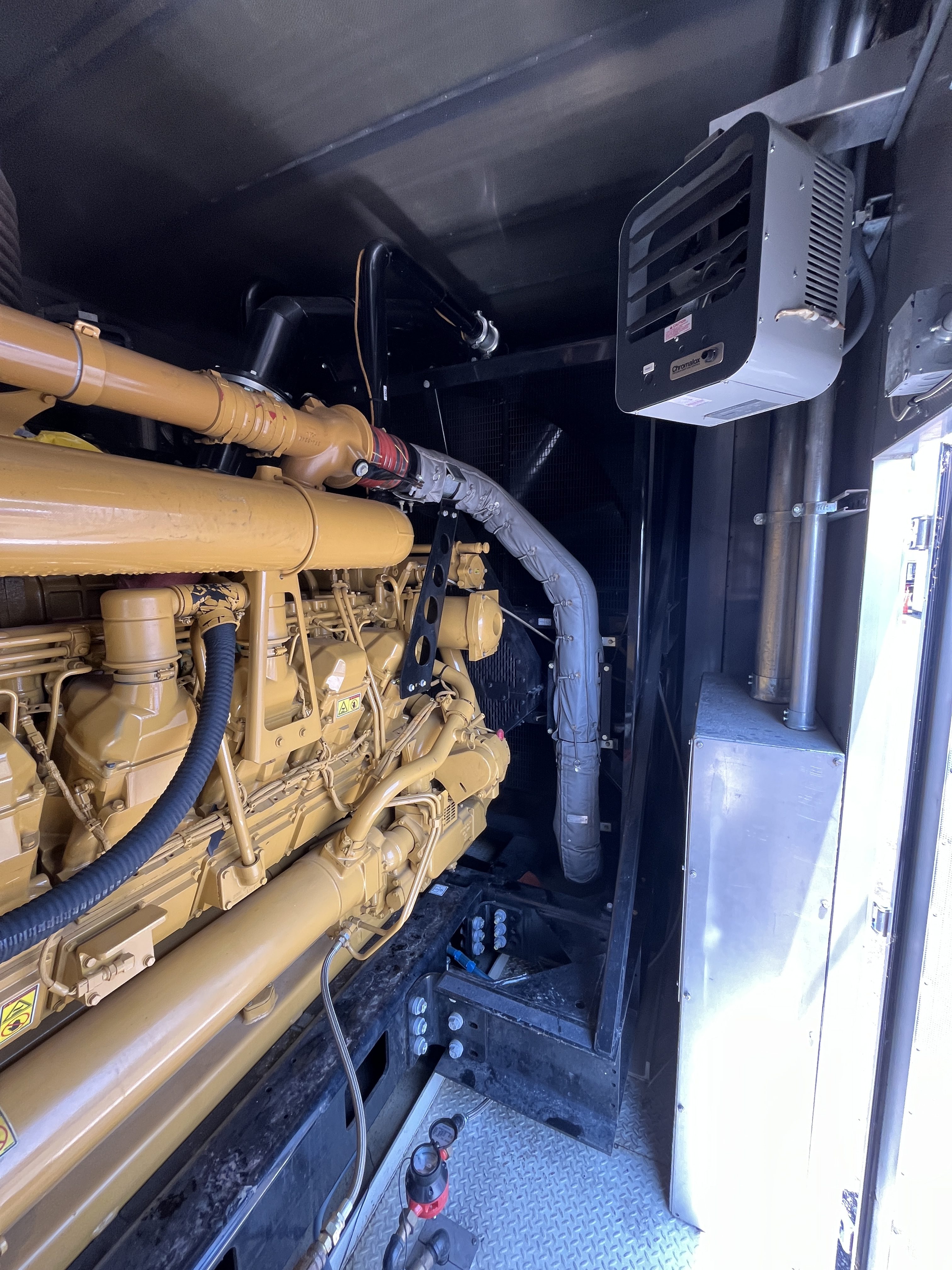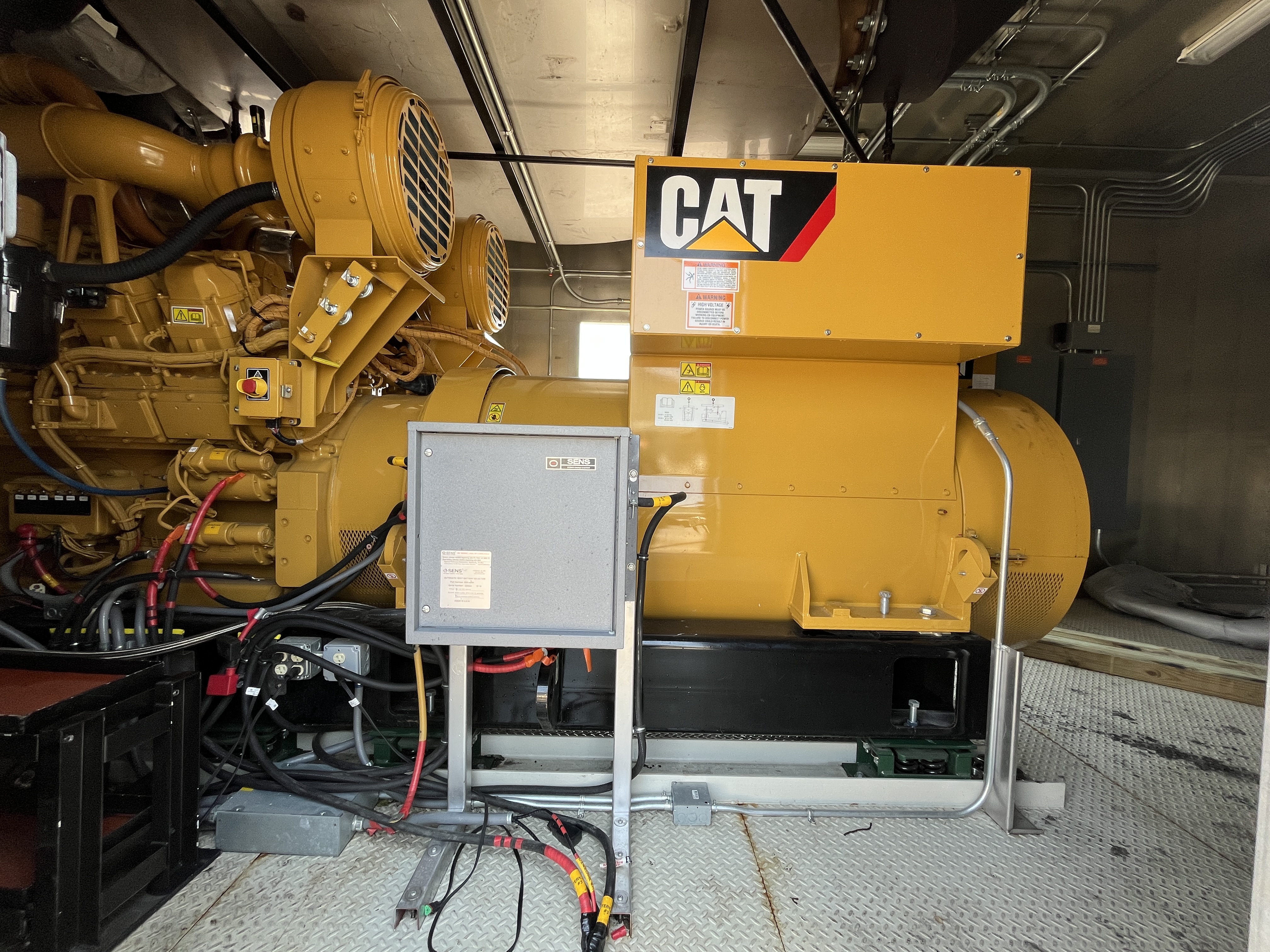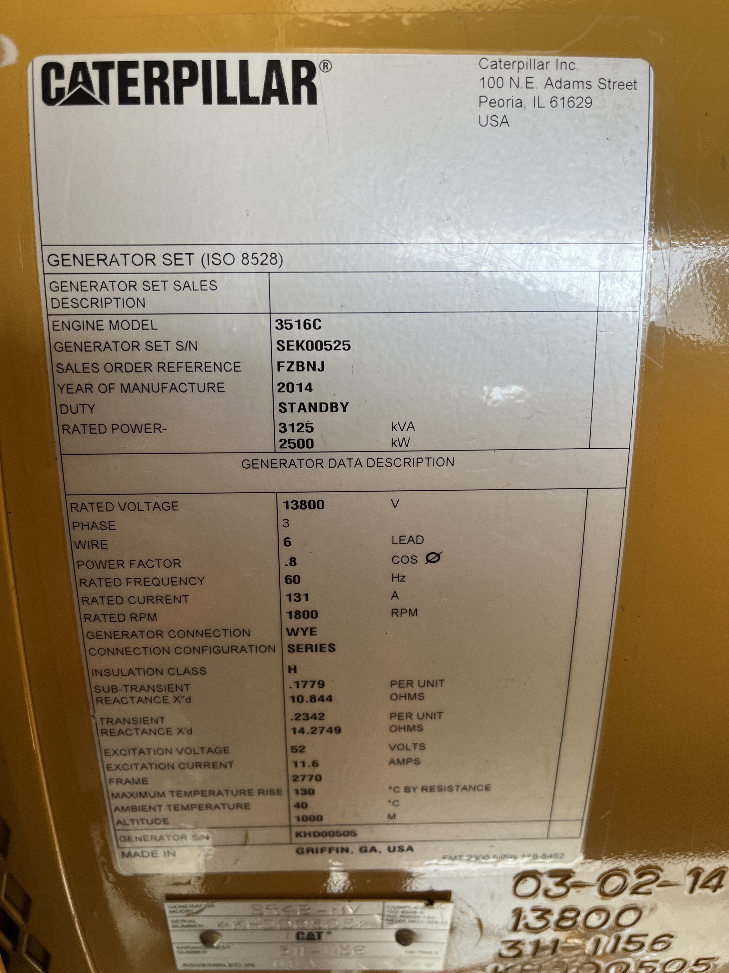 - DESCRIPTION: 2014 Caterpillar 3516C-HD Generator Set S#SEK00525, 2500kW Standby, 13,800V (6-Lead), Adjustable to 13,200V &12,470V, 60Hz, 1800RPM, CAT 3516C-HD Diesel Engine, 165 Hours, EPA Stationary Tier 2 Emissions Rated, 240VAC Jacket Water Heater, Engine-Driven Radiator, Pancake-Style Muffler System, Air Cleaners, EMCP 4.2 Digital Control Panel, CAT ADEM3 Electronic Governor, (3) 24V Electric Starters, Best Battery Starting System, 45A Charging Alternator, (3) Battery Chargers, Sound-Attenuated Enclosure Upon a 6500 Gallon Sub-Base Fuel Tank. SERVICE WORK: Generator Set Will Be Serviced and Load Tested to 100% Capacity. SHIPPING DIMENSIONS: L – 540” W – 150” H – 172” Weight: 100,000 lbs. Separated Dimensions: Enclosure: L – 540” W – 143” H – 140” Weight: 30,000 lbs. Gen/Tank: L – 540” W – 150” H – 158” Weight: 70,000 lbs. Ship Loose Items: Plenums Exhaust Stack