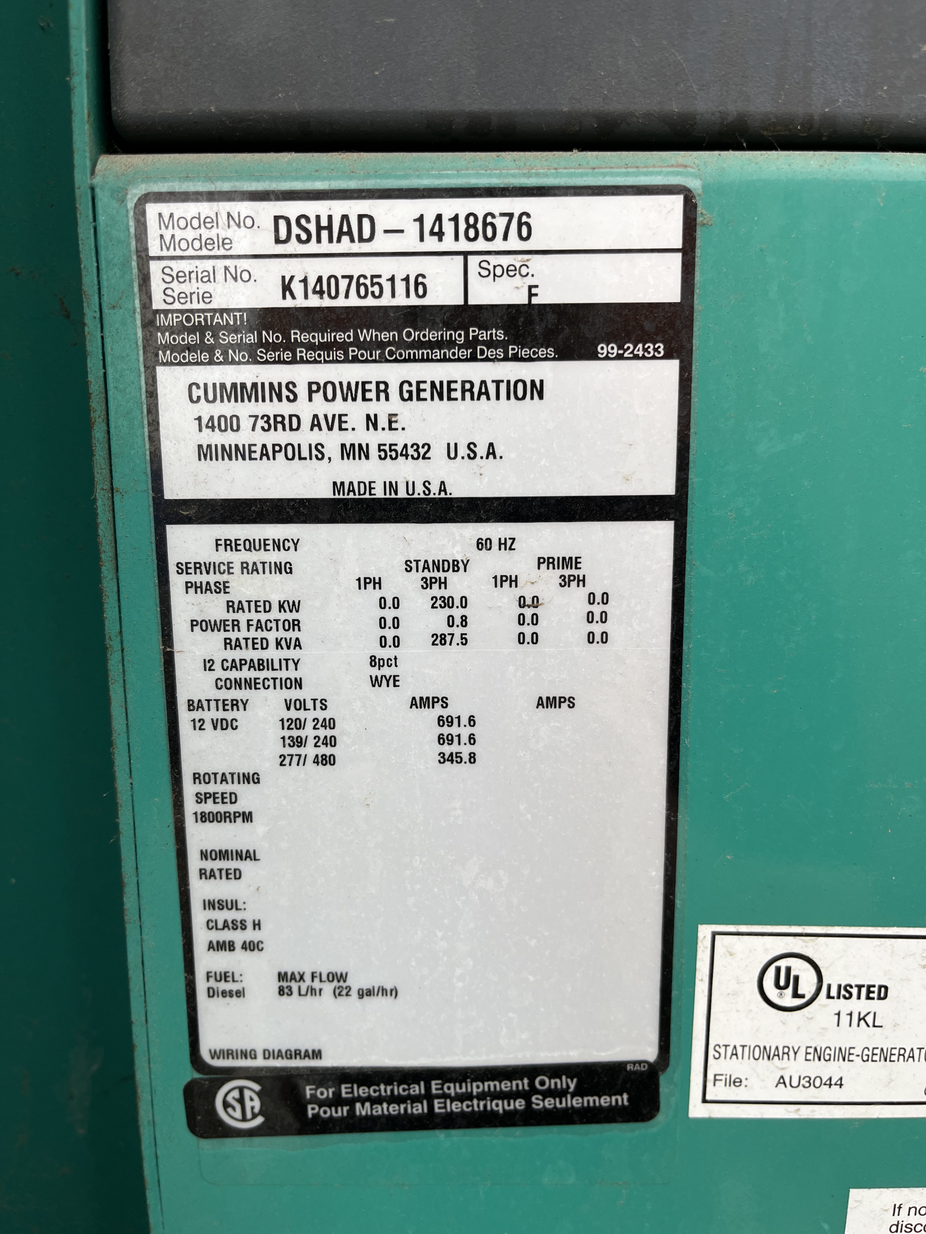 - DESCRIPTION: 2014 Cummins DSHAD Generator Set Serial# K140765116, 230kW Standby/209kW Prime, 480V, (12-Wire Reconnectable), 60Hz, 1800RPM, 75 Hours, Cummins QSL9-G2 NR3 Diesel Engine, EPA Tier 3 Emissions, Electronic Governor, Engine-Mounted Radiator, Air Cleaner, Jacket Water Heater, 12VDC Electronic Starter, 10A Battery Charger, 12VDC Charging Alternator, Power Command Digital Control Panel, Auto-Start/E-Stop, 400A Main Circuit Breaker, Weatherproof Enclosure Upon 365-Gallon Sub-Base Fuel Tank. DIMENSIONS: L – 105” W – 40” H – 88” Weight: 5,000 lbs.